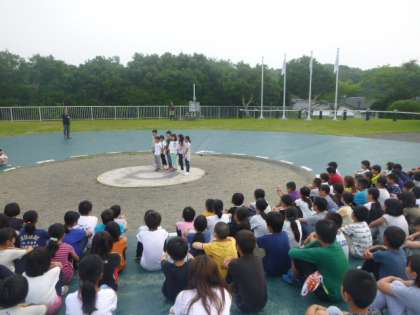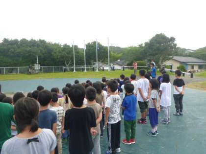 おはようございます。同じ期間で活動している3小学校合同の朝の集いをおこないました。校歌を歌い旗を掲げたあと、学校紹介をし合いました。最後に3小学校の全員で「やってみよう」を歌いました。歌声が山々に響き、海まで聞こえそうでした。これから、朝食です。天気は薄日が差す曇り空です。