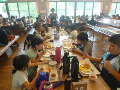 しっかり食べて次の活動に備えて欲しいです。今日はすべて館内で過ごします。朝食後は上里小学校と合同で自然の観察の仕方について山の家の講師の先生からお話を聞きます。その後,館内ラリーで楽しみます。