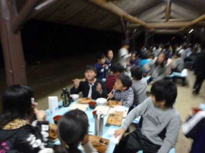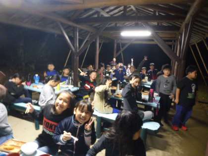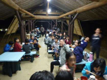 お風呂に入り,食事係さんが中心となって,食事の用意を行いました。お家から持ってきたお弁当以外での初めての食事,どんなメニューなのか楽しみにしている声があがっていました。次の日の活動のためにも,たくさん食べて体調を整えています。みさきの家の天気は,夕食の間に「雨」が降ってきました。今後のことも考慮して,ナイトハイクを取りやめ,雨メニューの「みさきの家すごろく」を行うことにします。