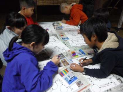 食事の後,東屋でひとりひとり「すごろく」づくりの用紙を受け取り,わくの中に「みさきの家に関すること」を記入していきました。みさきの家に来て,まだ1日目ですが,それぞれに活動で思ったことや考えたこと,さまざまな景色などを思い出して,わくの中に言葉を書き綴っていました。