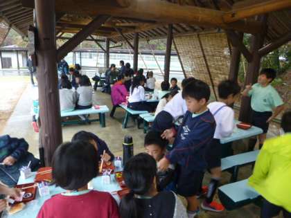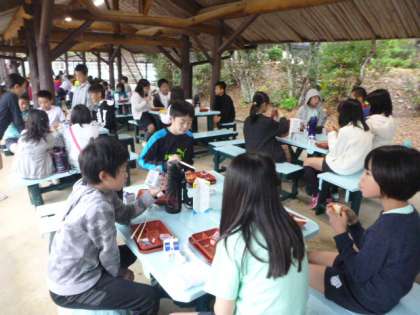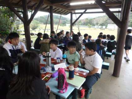 みさきの家での初めての朝食。磯観察に向かう服装で,おいしく頂きました。食べた後の容器やパックなどを分別して班で協力して片付けています。天候は,曇り空ですがこの後,英虞湾の生き物を水槽の中に移して,実際にさわる体験ができることになりました。その後,天候を確認し,磯観察に出発する予定でいます。