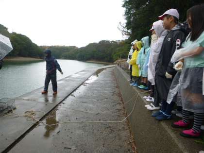 初めてみさきの家の野外炊事場に来ました。所員の方から,英虞湾に住む生き物のお話を聞き,すぐ横には,太平洋へと続く深谷水道が流れていました。