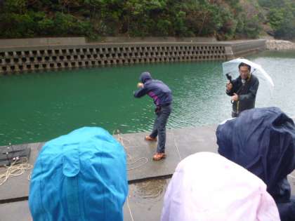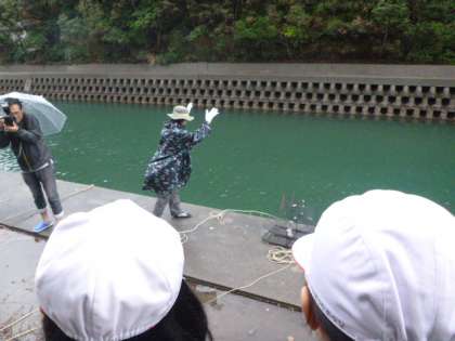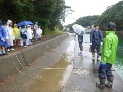 所員さんよりお話を聞いた後,1グループに1かごの「かご漁」を行うことができるようになりました。1クラス7かごを担任の先生が代表して,子どもたちの大きな掛け声とともに英虞湾へ投入します。それぞれにどんな生き物を獲ることができるのか。気持ちを高ぶらせながら,かごを引き上げる時間を待ちます。かごは,15時ごろに,1グループずつ引き上げる予定でいます。