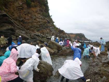 みさきの家を出発する時には少しだけ降っていた雨も,子どもたちが宮崎浜に到着するころには,雨もあがり,よい環境で磯観察を楽しむことができました。子どもたちも大きく広がる海を眺めながら,磯に住む「かに」や「やどかり」などを探したり,貝殻を集めてみたり,それぞれに楽しい時間を過ごしたようです。