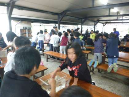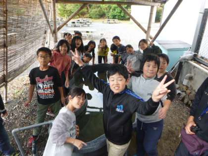 生き物が獲れたかごも獲れなかったかごも,力を合わせて野外炊事場の自分たちの座っている机へと運びます。獲れなかったかごには,前日までに所員さんたちが深谷水道でかご漁をして獲ってくれていた生き物を入れていただき,みんなで「漁の成果」を順番に席をかわりながら確認していきました。大きな水槽には,伊勢海老やほら貝などもいました。