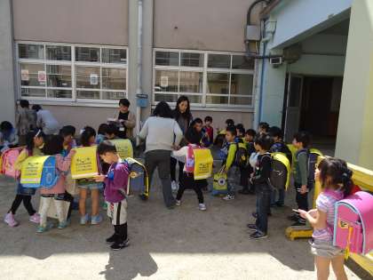 放課後,グループごとに集まって集団下校をしました。家の近くで友達と別れます。
