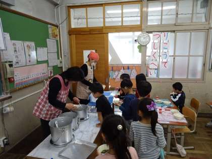 1年生の給食の様子です。みんなで食べる給食はおいしいようです。