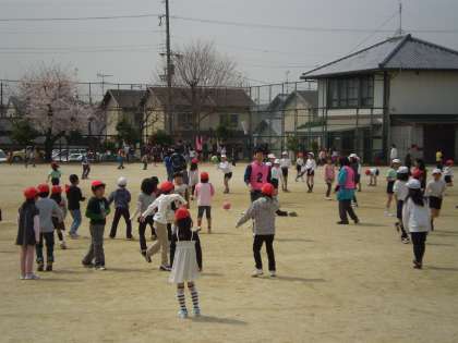 中間休みは運動場でたくさんの子どもが元気よく遊んでいました。赤いビブスを着た先生は、運動場での子どもの様子を見守りながら、一緒に遊んでいます。