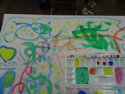 絵の具と水でいろいろな表し方ができることに気づき,自分の色や形を工夫して描きました。