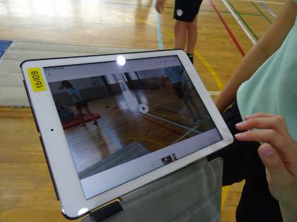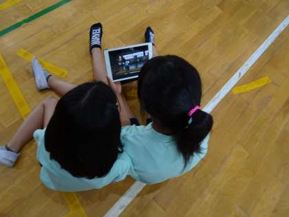 タブレット端末を使って,自分の技について友達とアドバイスをしあっています。