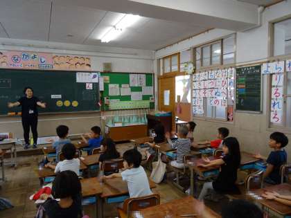 チャンツで英語の表現に慣れ親しんでいます。1年生はのりのりでした。