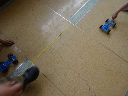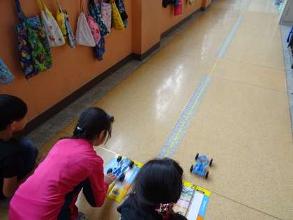 ゴムの力によって動く車を使い,ゴムの伸びと動き方の違いを比べながら調べました。
