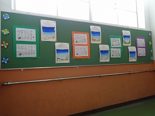 書写と絵の具の作品が掲示されています。