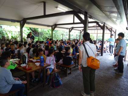 入所式後,野外炊事場で昼食です。日差しが強いので,屋根のあるテーブルで食べることにしました。