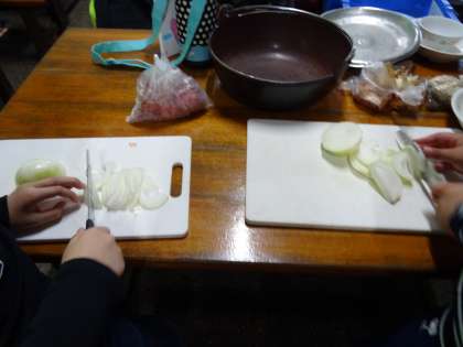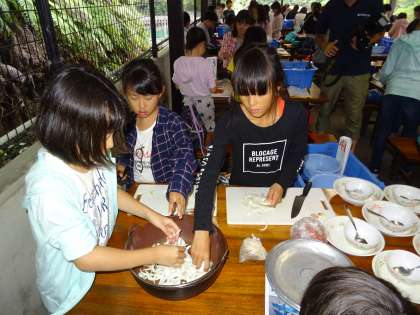 野外炊事のスタートです。係ごとにその役割を果たします。