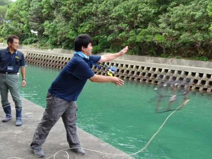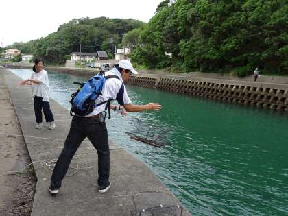 グループで決めた魚介類のコールの中,かごは投げ入れられました。