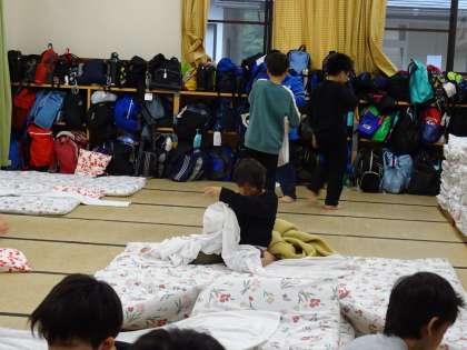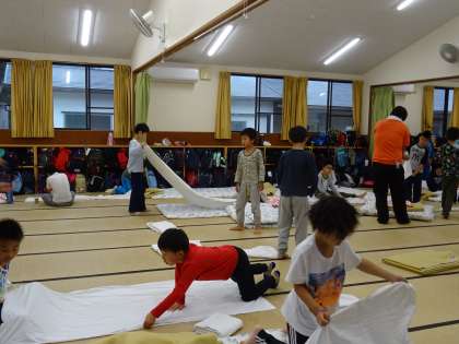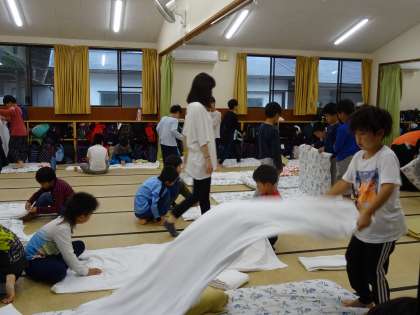 友達と協力して,寝具の後片付けをしました。シーツをたたむのは,難しそうでした。