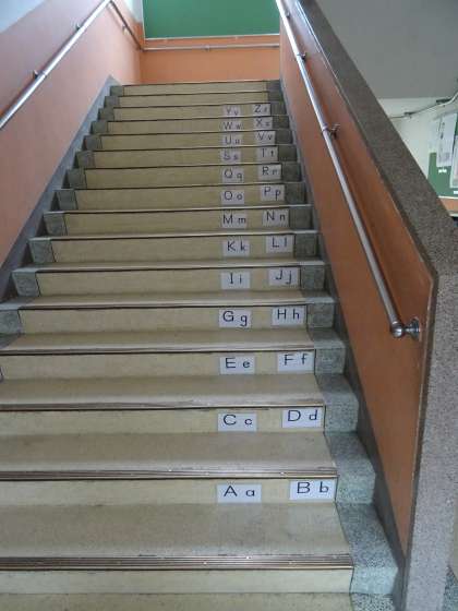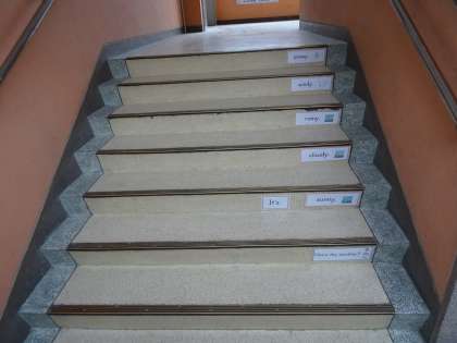北校舎西階段です。アルファベットや天候について掲示しています。