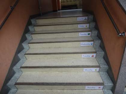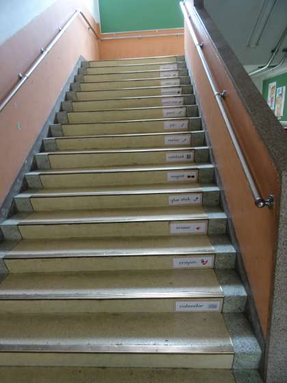 北校舎西階段です。文房具や曜日について,掲示しています。