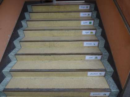 中校舎西階段の掲示物です。感情・図形・動物について掲示しています。