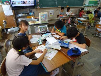 お話の絵を描くためにグループで協力し,タブレット端末を使って学習を進めています。