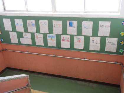 9月の学年掲示板です。夏休みの思い出を掲示しています。