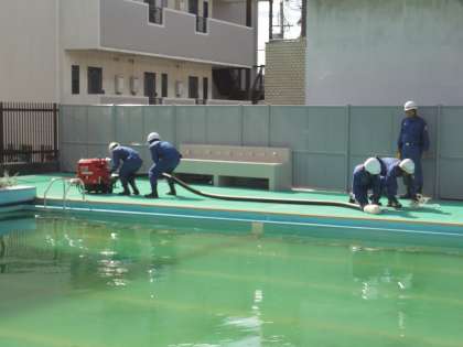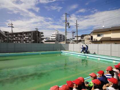 プールでは,ホースを使った放水の様子を見せてもらいました。