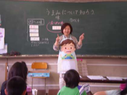 栄養教諭が5年生でうま味についての授業を行いました。甘味・酸味・塩味・苦味の4つの味をおさらいした後、「うま味」について学習しました。1の汁(水・しょうゆ・塩)と2の汁(水・しょうゆ・塩・昆布・けずりぶし)の味を比較しました。そして、昆布やけずりぶしから出る味が「うま味」であることを確かめました。「かきたま汁やたけのこ汁の味や」と声があがっていました。うま味は700年も前から伝えられた味であることや「うま味」は100年ほど前に日本の池田菊苗氏が発見したことも知りました。