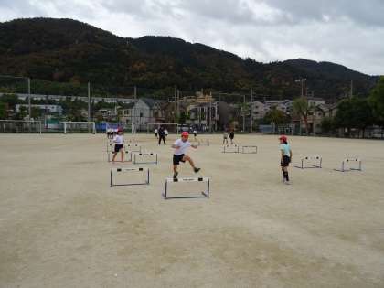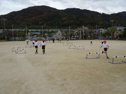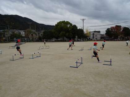 3台の小型ハードルを3歩のリズムで走り越す工夫をして,同じくらいの走力の相手と競走して楽しみました。