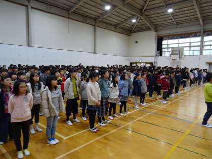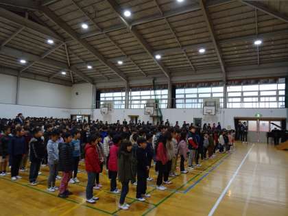 3学期の始業式です。校歌斉唱です。