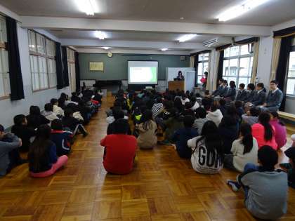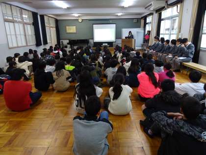 1月23日(木)大宅中学校生徒会のみなさんが小学校を訪問されました。各委員会活動や学校生活,部活動などについて,説明がありました。