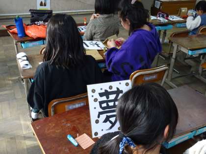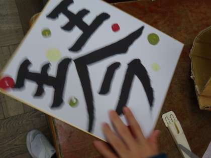 書道クラブです。好きな一字を色紙に書きました。