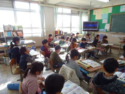 互いの歌声を聴き合いながら,声の出し方に気を付けて輪唱で歌いました。