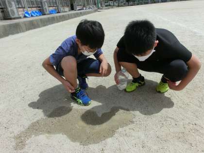 理科の学習で「雨水の行方」を学習しています。降った雨がどのように流れるのか,実際に運動場に水を流し,水の行方を調べました。少しの坂で水が流れることや,土にすぐにしみ込む様子をじっくりと観察していました。