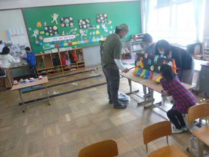 今日の授業参観は,各クラスに分かれて行いました。1教室は音に合わせて楽しく演奏をしました。2教室は,友達があったらいいなと考えた道具について感想を伝えたり質問をしたりしました。3教室では,自分や家族にあったらいいなと思うものを想像しあいました。4教室では,木を組み合わせてオリジナルパズル作りに挑戦しました。