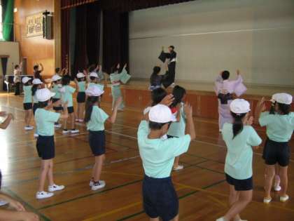3年生児童が,女性会の方に山科音頭を教えていただきました。涼しげな浴衣姿にうっとりとしながらも,たいへんな暑さの中,汗をかきながら振り付けを覚えました。振り付けのまとまりを覚えたら後は繰り返しです。子どもたちは,あっという間にマスターしました。さすが!!
