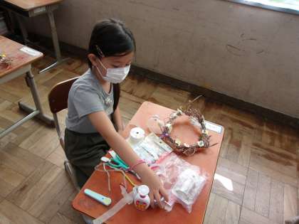 モール,ビーズ,折り紙,リボンなどを重ねたり通したりして,工夫しながら飾りつけを進めました。