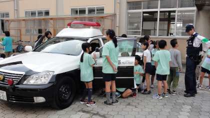4年生は安全について学習をしています。先日地域の交通安全対策協議会,交通安全女性の会の方々にお越しいただいて、自分たちが見守られていることを学びました。今日は山科警察の方に来ていただいて警察の仕事について学習しました。また、パトカーや白バイについても詳しく話していただきました。
