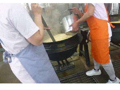 「かきたま汁」は,だし昆布とけずりぶしでとっただし・塩・しょうゆでとうふを煮,水どきの片栗粉・割りほぐした卵・ほうれん草を加えて仕上げました。ふわふわの卵を楽しんでいただきました。