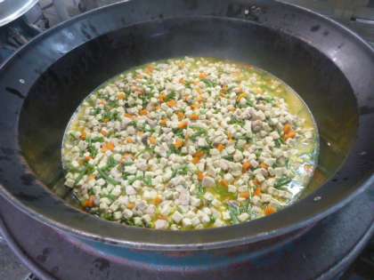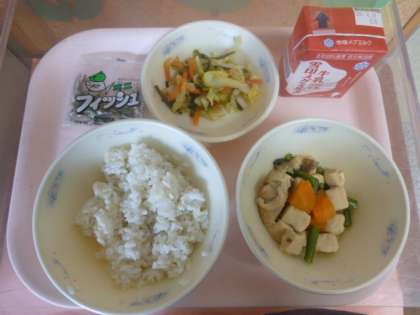「高野どうふと野菜のたき合わせ」は,鶏肉・にんじん・しいたけを煮,別の釜で煮た高野どうふを入れて,最後に三度豆を加えて仕上げました。彩りもよく,けずりぶしやしいたけのだしがしみこんでいました。