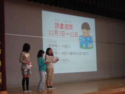 7日の朝会では、学校長の話の後、環境委員会・図書委員会からお知らせがありました。また飼育委員会から飼育クイズがありました。その後大宅タイムでは6年生が陸上の取組を報告してくれました。大文字駅伝支部予選会が24日に行われます。日頃の練習の成果を期待しています。