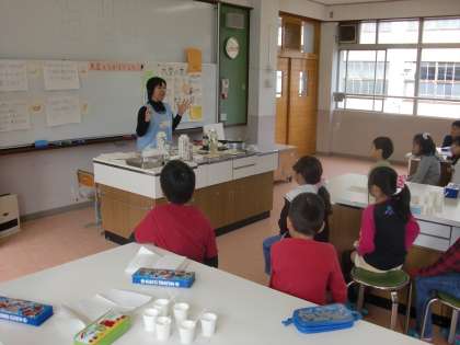 家庭科室で大豆についての栄養学習です。大豆から作られた食べ物や,大豆はからだの中でどう働くかについて学習しました。実際に湯葉や豆乳,いり豆を試食しました。家庭科室はいり豆のこうばしいにおいに包まれて,子どもたちも楽しく学習できました。