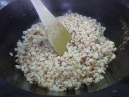 「かみなりこんにゃく」は,こんにゃくを油でいためた料理です。こんにゃくをいためるときに「バリバリ」と,かみなりのような音がすることから,この名前がついたといわれています。給食では,だし汁・さとう・みりん・しょうゆで味つけし,最後に花かつおをくわえて作りました。