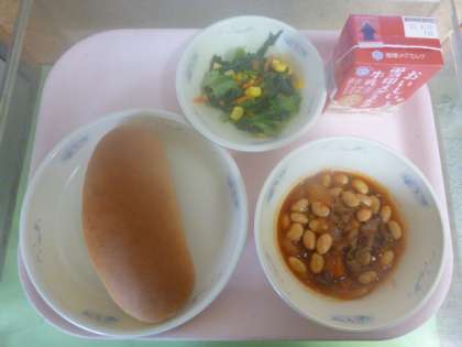 「大豆と牛肉のトマト煮」は,牛肉・たまねぎ・にんじん・大豆をホールトマトやトマトケチャップ,ウスターソースでじっくりと煮込んで作りました。パンといっしょにおいしくいただきました。