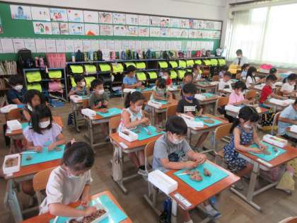 図工の時間に,ねんどを使ってごちそうを作ってパーティーをしました。ケーキを作ったり,ピザを作ったり,果物やお菓子を作ったりしました。「とってもおいしそうでしょ?」と友だち同士で話していたり,ケーキにろうそくやいちごをのせてトッピングをしたりしていました。また,食べ物をのせるお皿まで工夫して作る姿がみられました。