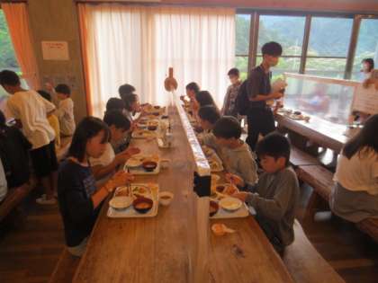 夕食です。みんなたくさん活動したのでお腹がペコペコ。もりもり食べています。