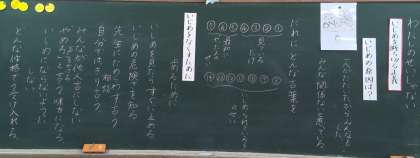 「わたしのせいじゃない」と言っている子どもたちの考え方から,いじめに対する傍観者としての無責任な気持ちがいじめを生んでいることを理解し,いじめを止めるためには,どのような声をかければよいかを考えました。そして,いじめをなくすために大切な考えについて意見を交流し,考えを深めました。いじめを許さない心を大切にしてほしいです。