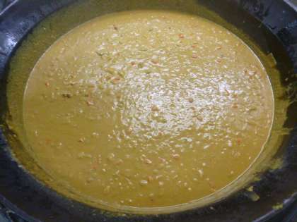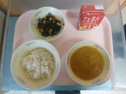 給食のカレーは、給食調理員さんが手作りでルーを作り、カレー粉やトマトピューレ・フルーツチャツネ・バーベキューソース・ウスターソースなどいろいろな調味料を使っています。また、ヨーグルトやチーズを加えてまろやかな味に仕上げています。「今日はカレーや!やった〜!」と子どもたちはとても喜んでいるようすでした。ごはんといっしょにしっかりと食べている子がたくさんいました。