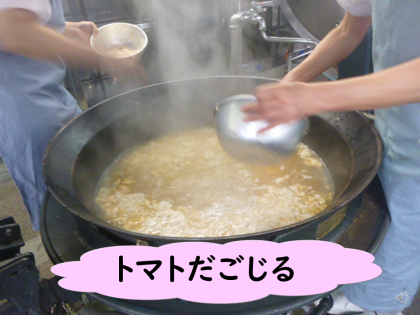 「だご汁」は、九州地方でよく食べられています。「だご汁」の「だご」とは「だんご」のことです。給食では、トマトを使って「だんご」を作りました。だんごの中にも、汁の中にもトマトを使い、きれいな色やさわやかな酸味を楽しみながらいただきました。