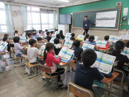 今,音楽科では鍵盤ハーモニカを使った学習をしています。「ドレミの歌」や「カエルの合唱」など,みんなが知っている歌を楽しく演奏しています。